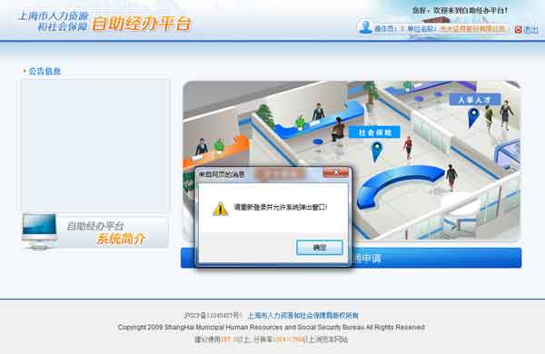 登录上海社保自助经办平台提示请重新登陆并允许系统弹出窗口解决方法: