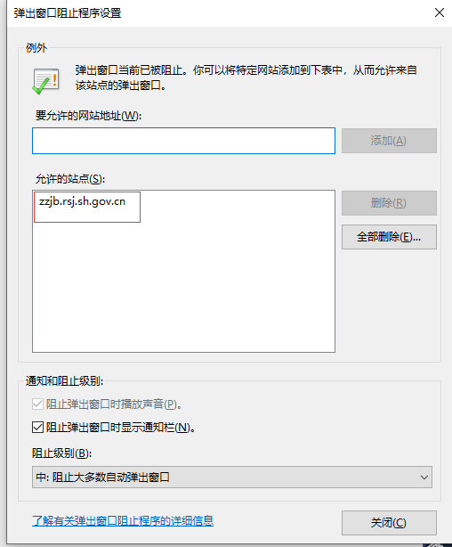 或者将“zzjb.rsj.sh.gov.cn”添加到信任列表 步骤:internet 选项>隐私>设置> 将网站输入到“要运行的网站地址">点击添加,如下图:
